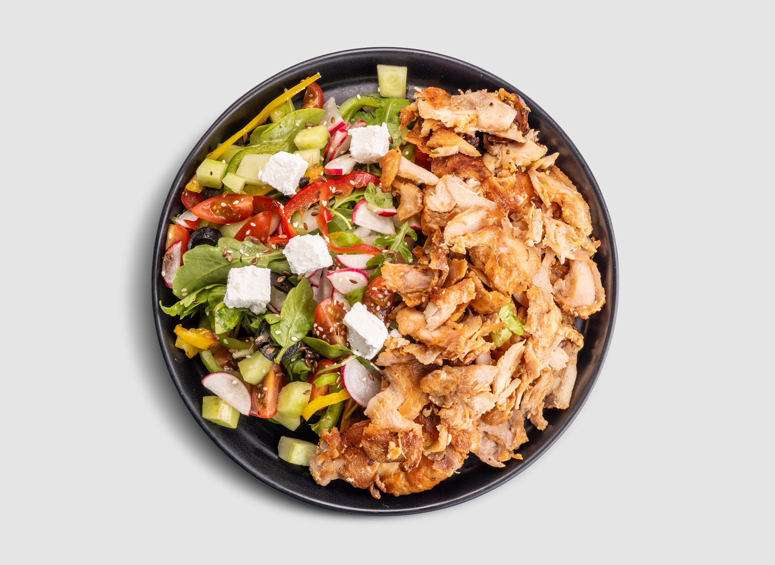 rukkola, döner (csirke) hús, uborka, koktél paradicsom, zöld olajbogyó, fekete olajbogyó, feta sajt, paprika csíkok, retek (szezonális), vinegrette öntet