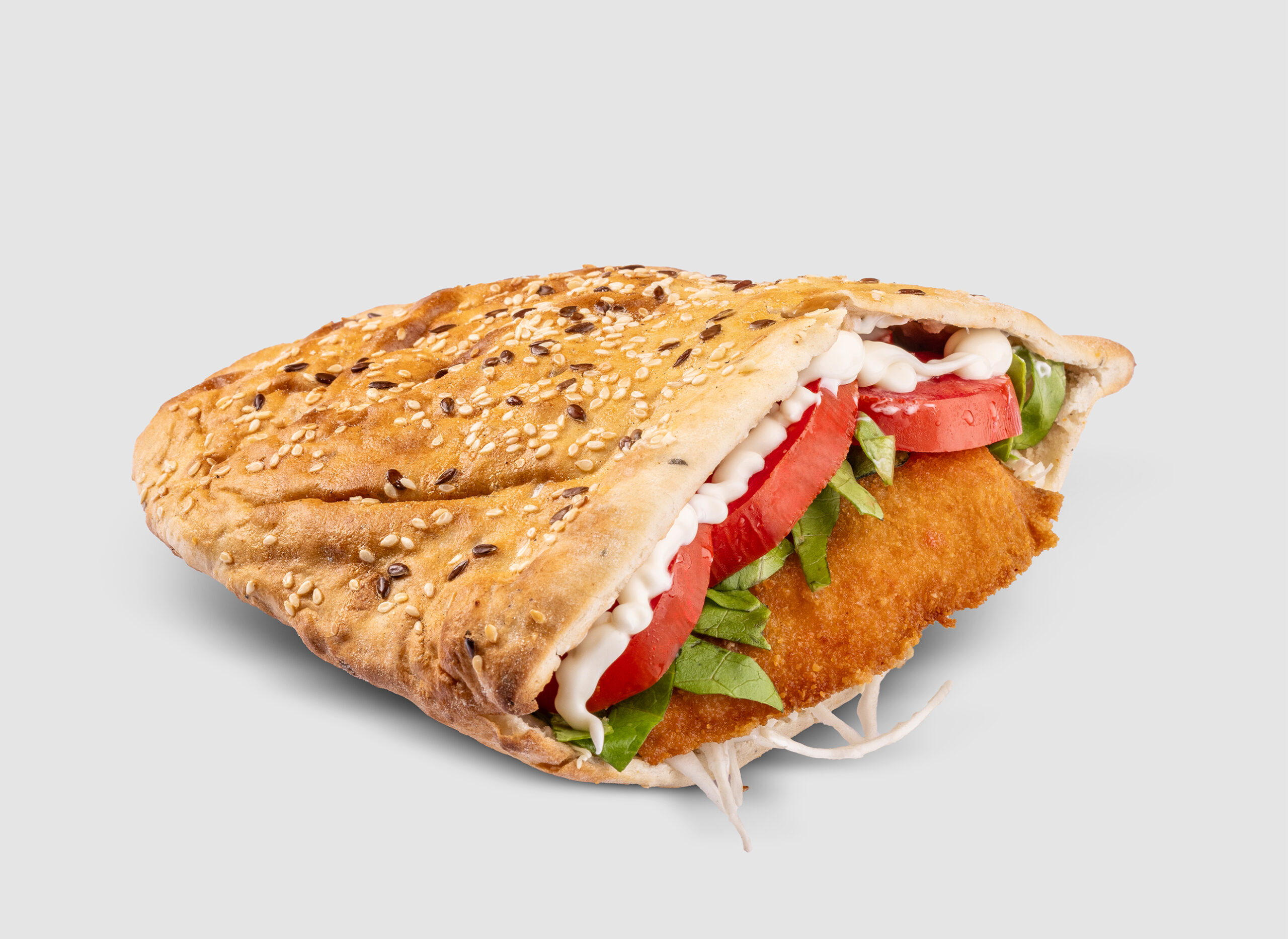 házi sütésű pita kenyér, panírozott csirkemell, káposzta, lila hagyma, paradicsom, majonézes-fokhagymás szósz, csípős szósz, pasa szósz