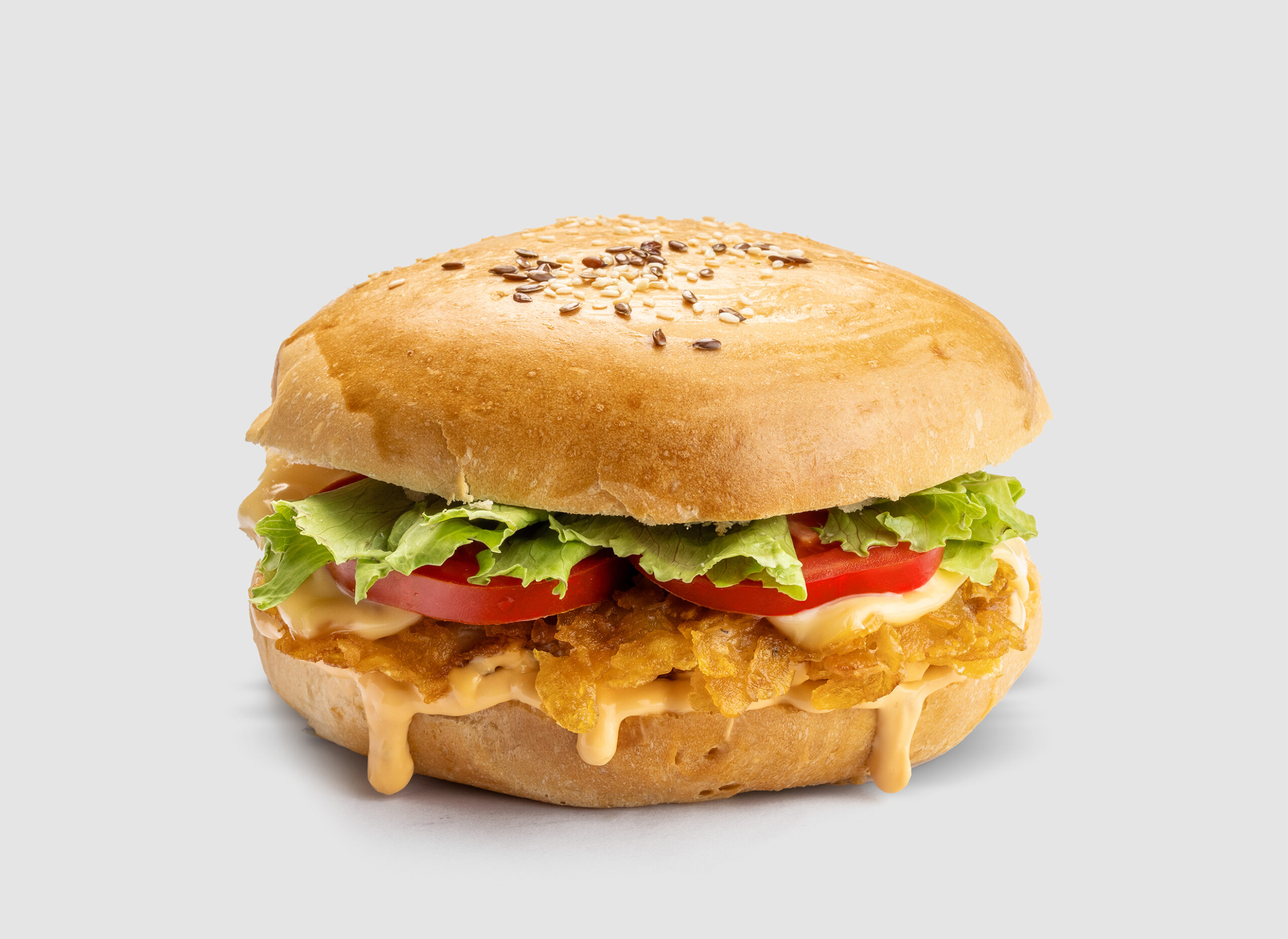 crispy, roșii, iceberg,brânză topită cu brănză gouda , chiflă, sos