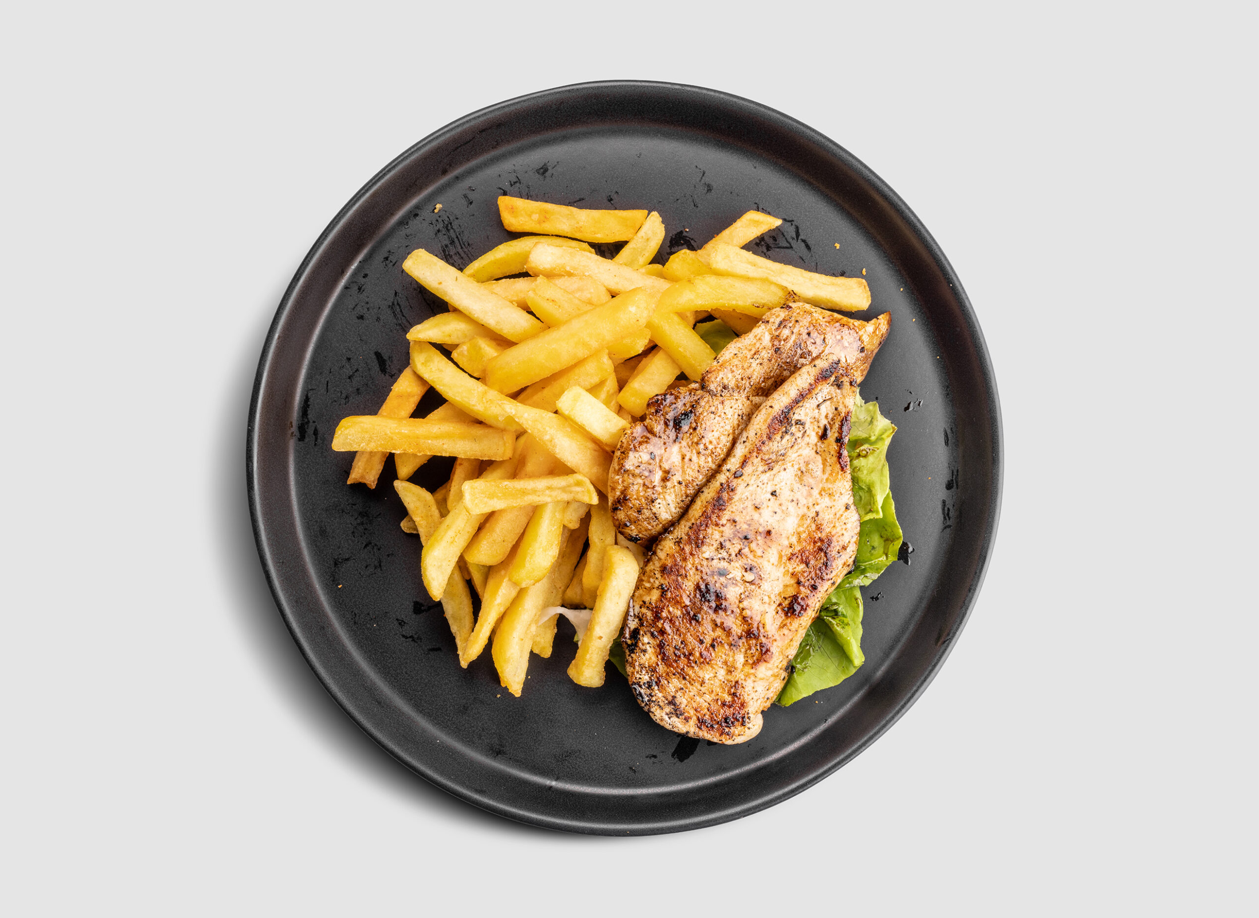 110 gr piept de pui, 150 g cartofi prajiti, 20 gr sos la alegere